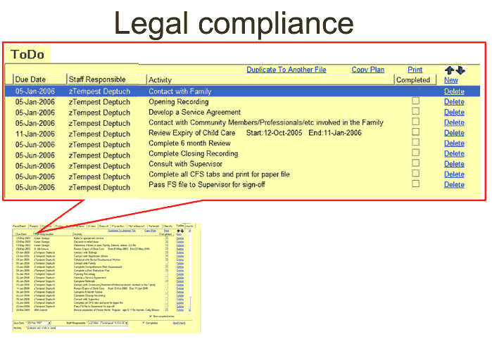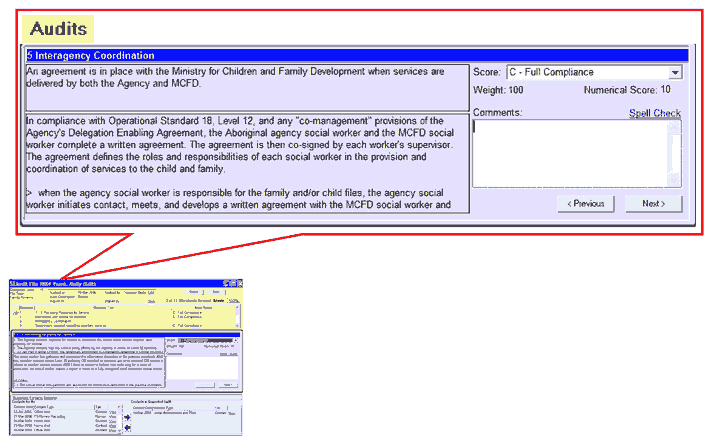 An audit function is built right in to CFS Best Practice. This function allows workers to audit themselves to identify any areas where they may be lacking in compliance. The results of a self-audit are shown as a spreadsheet indicating areas that need attention.